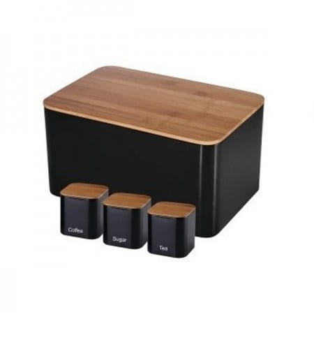 Chlebak wykonany jest z wysokiej jakości stali, z pokrywa bambusową. W zestawie oprócz chlebaka, znajdują się 3 dodatkowe pojemniki na kawę, herbatę i cukier – ich wymiary – 11cm x 12cm